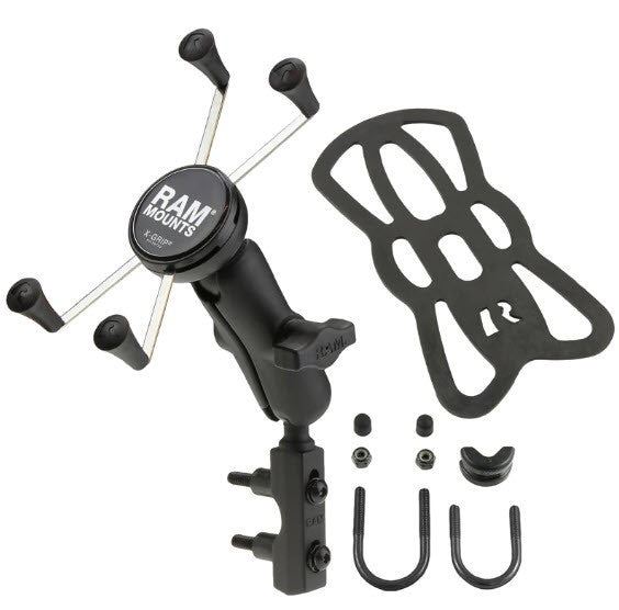 The RAM-B-174-UN10 consists of hardware for mounting to either brake/clutch reservoirs and rails that are 0.5" to 1.25" in diameter, double socket arm and universal X-Grip® large phone/phablet holder. Designed into the mount is a 1" diameter patented rubber ball and socket system with adjustment points at both ends of the socket arm; this with a twist of the arm knob, allows you to move the X-Grip® mount to your optimum viewing position. The mounting hardware for brake/clutch reservoirs include both standard and metric mounting bolts. The included X-Grip® cradle has a clean and clever four leg design that sports great holding power without hiding your phone behind foam pads and plastic. The spring loaded X-Grip® cradle expands and contracts, allowing for a perfect custom fit of your cell phone. The perfect complement to the modern sleek interior of today's vehicles, the RAM X-Grip® is the cell phone cradle evolved. The X-Grip® includes a device tether recommended for outdoor applications. The cradle is compatible with handheld devices that will fit the dimensions listed below. It is important to verify the dimensions of your handheld device with a case/sleeve/skin when determining the overall size.