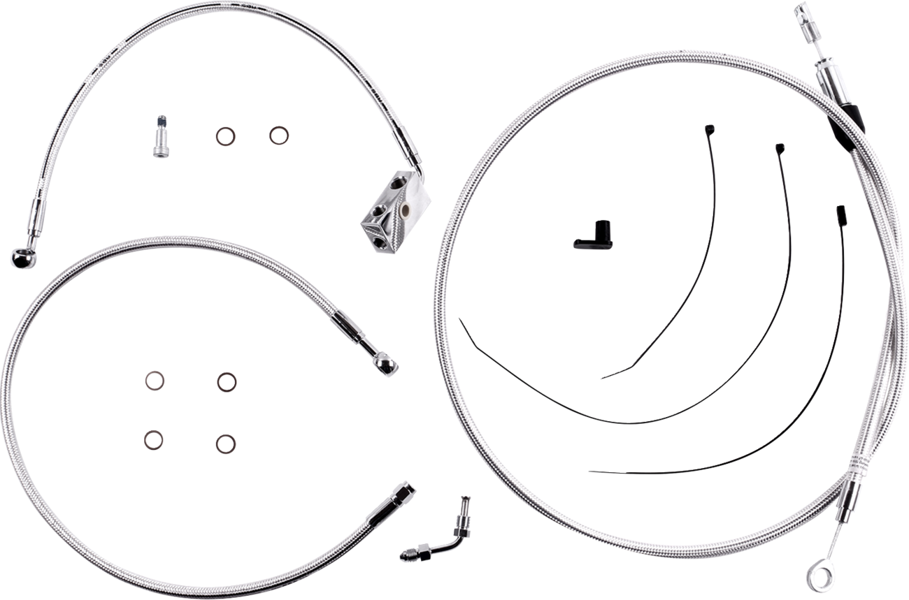 • Kit includes throttle and idle cables of throttle-by-wire extensions, clutch cable or hydraulic clutch line, brake lines, copper crush washers, hardware, and any necessary switch wiring of turn signal extension