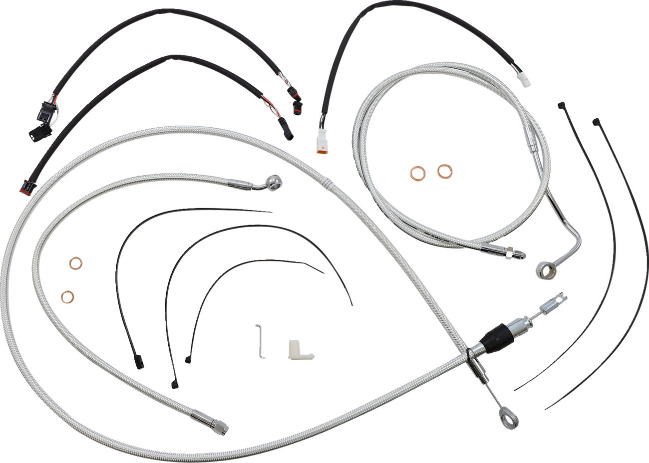- Kit includes throttle and idle cables of throttle-by-wire extensions, clutch cable or hydraulic clutch line, brake lines, copper crush washers, hardware, and any necessary switch wiring of turn signal extension