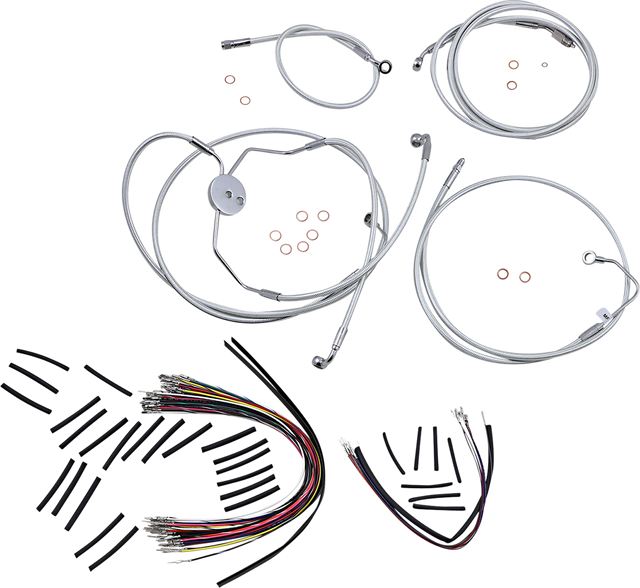 • Kit includes throttle and idle cables of throttle-by-wire extensions, clutch cable or hydraulic clutch line, brake lines, copper crush washers, hardware, and any necessary switch wiring of turn signal extension
