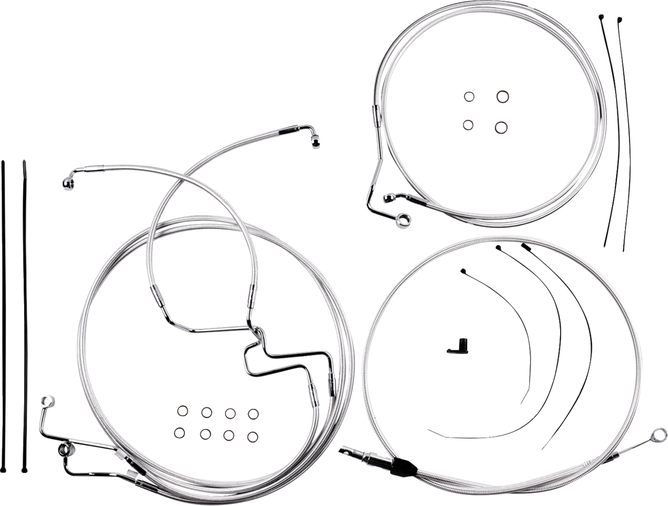 • Kit includes throttle and idle cables of throttle-by-wire extensions, clutch cable or hydraulic clutch line, brake lines, copper crush washers, hardware, and any necessary switch wiring of turn signal extension